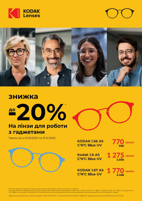 *Деталі у продавців-консультантів. Реклама медичного виробу. Перед застосуванням обов’язково проконсультуйтеся з лікарем. Знижка до -20% поширюється на обрані позиції лінз бренду Kodak. Акція діє з 01.09.2025 р. по 30.11.2025 р. включно.