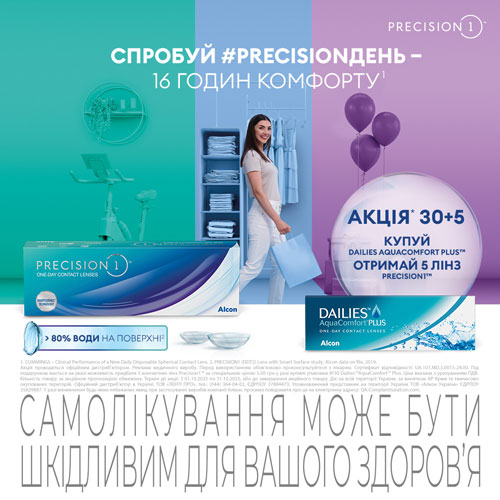 Купуйте з 1 по 31 жовтня 2025 року упаковку DAILIES AquaComfort Plus (30 шт.) та отримуйте +5 лінз Precision 1 тієї ж рефракції у подарунок*.