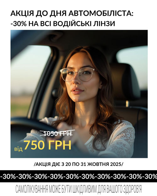 До Дня автомобіліста у мережі салонів "Ваша Оптика" з 20 по 31 жовтня діє знижка -30% на водійські лінзи до окулярів.